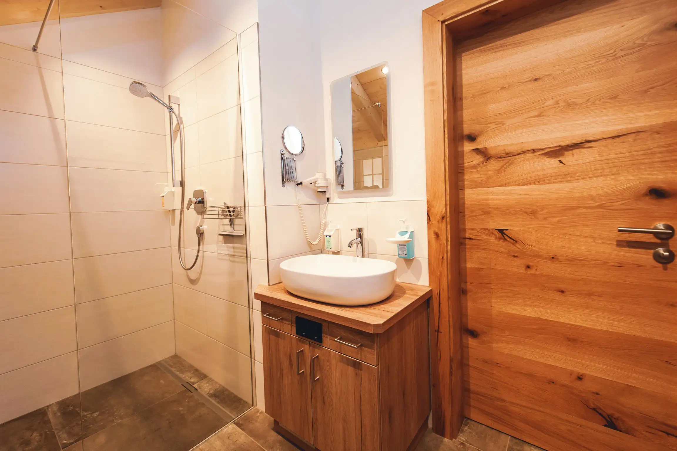 Das neue Badezimmer ist gleich nebenan und dann kommt man in den Salon mit einem alten